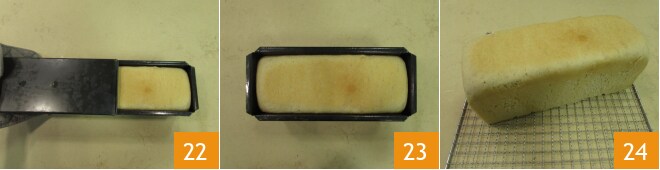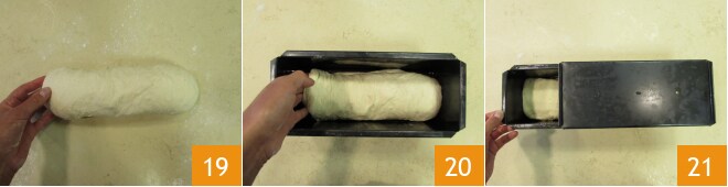 Você deve obter um filão do mesmo comprimento da forma 19. Coloque o filão na forma 20, feche com a tampa 21 e deixe crescer em temperatura ambiente por cerca de 2 horas.