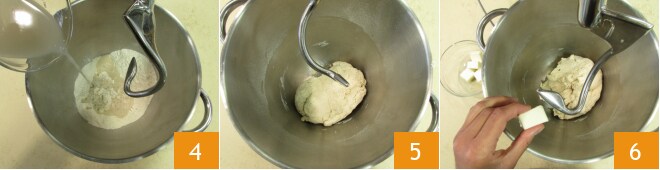 e a água com o fermento 4. Ligue a batedeira em baixa velocidade para misturar bem todos os ingredientes, até obter uma massa lisa e homogênea 5. Neste ponto, adicione aos poucos a manteiga, garantindo que seja completamente absorvida antes de adicionar mais 5.