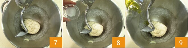 Quando a manteiga estiver bem absorvida 7, adicione o sal 8 e o óleo 9.