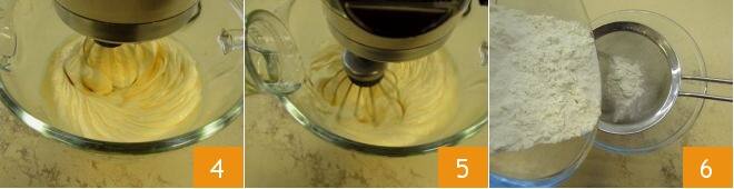 até obter uma mistura branca e espumosa 4; se você não tiver uma batedeira, pode usar um batedor elétrico. Adicione o óleo vegetal em fio enquanto a batedeira está em funcionamento 5. Em uma tigela separada, peneire a farinha, o amido de batata e o fermento 6 e misture-os.
