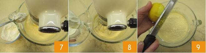 Junte os ingredientes secos à mistura na batedeira, uma colher de cada vez 7, sem parar de bater. Depois de adicionar todos os ingredientes secos, adicione o iogurte em 2-3 vezes, mantendo sempre a batedeira em funcionamento 8. Quando a mistura estiver bem homogênea, desligue a batedeira, adicione as raspas de limão ralado 9 e misture bem com uma espátula.