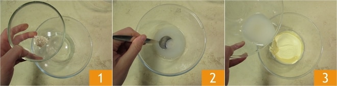 Para preparar o pão de sêmola, a primeira coisa a fazer é a biga. Despeje a água em uma tigela, adicione o fermento esfarelado 1 e misture até dissolvê-lo 2. Despeje a sêmola em outra tigela e adicione a água na qual você dissolveu o fermento 3.
