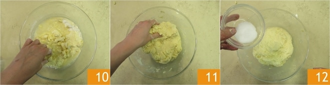 Sove diretamente com as mãos 10 até obter uma massa homogênea 11, depois adicione o sal 12 e continue sovando.