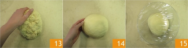 Transfira a massa para a bancada de trabalho 13 e sove até que fique lisa 14. Transfira-a para uma tigela, cubra com filme plástico e deixe descansar por 10 minutos.