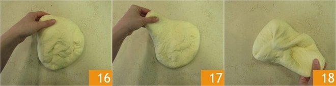 Transfira novamente a massa para a bancada de trabalho 16. Pegue uma das bordas da massa, estique-a delicadamente e leve-a ao centro 17. Repita essa operação para os outros 3 lados 18.