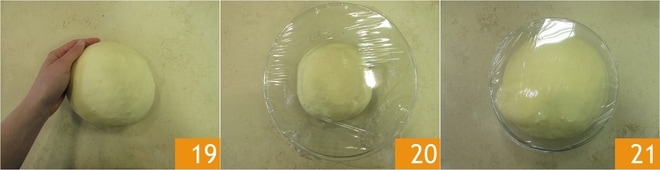 Vire a massa e modele-a para que adquira uma forma esférica 19. Transfira para uma tigela untada, cubra com filme plástico 20 e deixe fermentar por 3 horas em temperatura ambiente, ou até dobrar de volume 21.