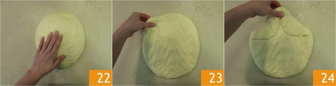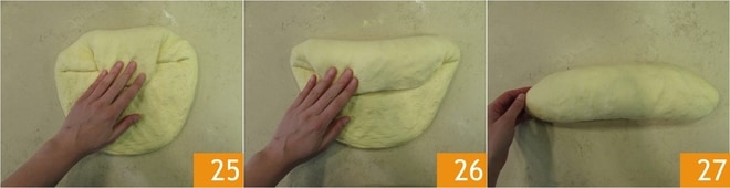 Agora, transfira a massa para a bancada levemente enfarinhada com sêmola 22. Achate-a delicadamente com as mãos 23. Levante a borda esquerda e dobre-a para dentro. Faça o mesmo com a borda direita 24.