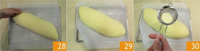 Agora, coloque-o em uma assadeira com papel manteiga 29. Deixe fermentar por cerca de meia hora, deixando-o descoberto 29. Neste ponto, polvilhe com uma peneira a farinha de sêmola sobre o cilindro 30.