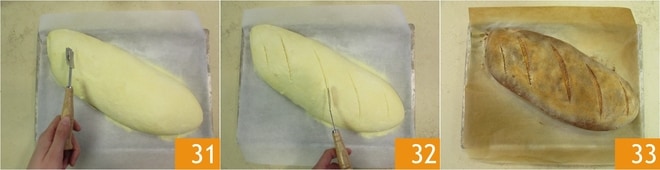 Usando uma lâmina, faça o primeiro corte oblíquo no cilindro 31, depois faça outros de forma paralela 32. Asse em forno estático pré-aquecido a 250°C por 35 minutos na prateleira do meio. Após esse tempo, abra o forno para liberar a umidade formada e diminua a temperatura para 180°C. Feche o forno novamente e termine de assar por mais 10 minutos. O pão estará pronto para ser retirado do forno 33. Transfira-o para uma grade e deixe esfriar completamente antes de cortá-lo.