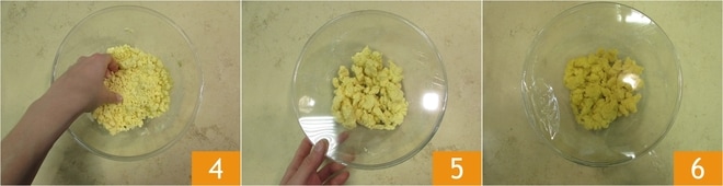 Sove com as mãos 4 até obter uma mistura homogênea, sem deixar farinha na tigela. Cubra com filme plástico 5 e deixe fermentar em temperatura ambiente por 18 horas. É normal que após o tempo indicado a biga não tenha aumentado seu volume 6.
