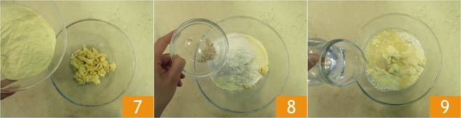 Passado esse tempo, prepare a massa. Se a tigela em que você fez a biga for pequena, transfira-a para uma maior. Adicione a sêmola 7, a farinha 0 e o fermento esfarelado 8. Adicione também a água 9.