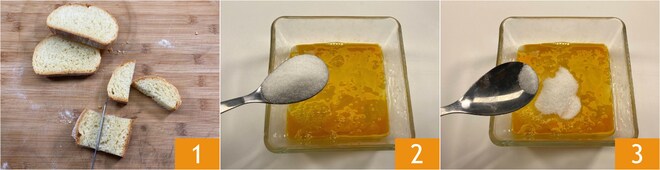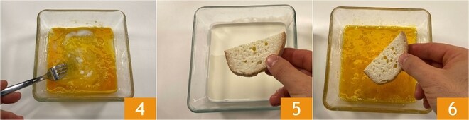 Bata bem com um garfo 4. Mergulhe rapidamente cada pedaço de pão primeiro no leite 5 e depois na mistura de ovos 6, deixando escorrer o excesso de líquido.