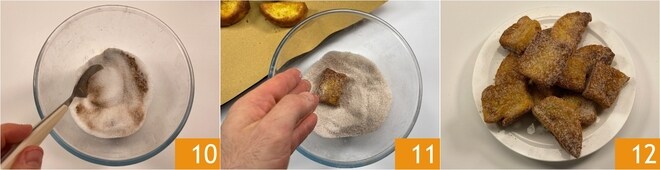 Em outra tigela, misture o açúcar com a canela 10. Cubra os cubos com o açúcar aromatizado 11 e sirva imediatamente o seu pão doce frito 12!
