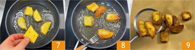 Neste ponto, aqueça em uma panela uma quantidade de óleo de sementes suficiente para cobrir o fundo, não deve estar fervendo. Coloque os pedaços de pão no óleo quente 7 e deixe dourar por alguns minutos de cada lado 8. Escorra o pão em papel absorvente ou para fritura 9.