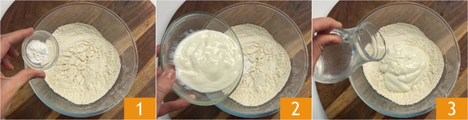 Para preparar o pão naan com iogurte, coloque a farinha em uma tigela, depois adicione o fermento 1, o iogurte branco 2 e a água 3.