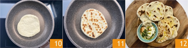 Cozinhe os naan em uma frigideira antiaderente em fogo alto por cerca de 3-4 minutos de um lado 10 e 2 minutos do outro lado, ou até ficarem dourados 11. Sirva seu pão naan com iogurte ainda quente 12!