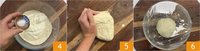 Adicione também o sal 4 e misture tudo com uma colher, depois transfira a massa para a bancada e trabalhe com as mãos até obter uma massa lisa e homogênea 5. Deixe a massa descansar na tigela, coberta com filme plástico, por cerca de uma hora 6.