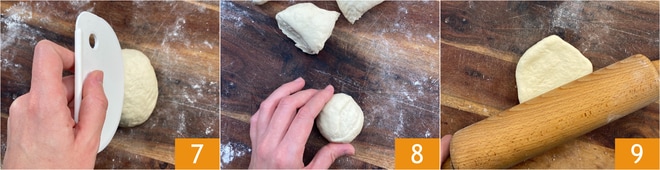 Após este tempo, divida a massa em 6 porções 7, forme bolinhas 8 e abra com um rolo até formar discos com espessura de cerca de 3 mm 9. Se a massa tender a encolher, deixe os discos descansarem por alguns minutos e, em seguida, abra novamente ajudando-se também com as mãos.