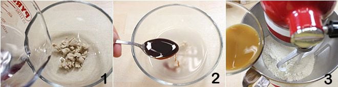 Para preparar o pão recheado com bacon e figos, comece pela elaboração da massa de pão (para mais detalhes sobre a elaboração da massa de pão clique aqui): dissolva o fermento biológico em um pouco de água morna (retirada da quantidade total de água prevista para a receita) 1 junto com uma colher de chá de malte (ou açúcar, se não tiver esse ingrediente específico) 2. À parte, peneire a farinha de trigo comum e a farinha manitoba e coloque-as na batedeira, depois adicione a mistura de fermento e malte e ligue o aparelho para misturar todos os ingredientes 3.
