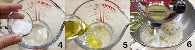Na água restante, dissolva o sal 4 e adicione o óleo 5, misture bem, depois despeje o líquido obtido na farinha, continuando a misturar 6. Sove tudo por 10 minutos, ou até obter uma massa compacta.