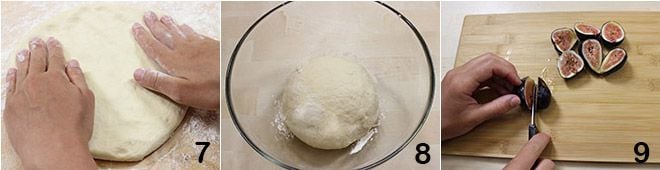 Transfira agora a massa para uma superfície enfarinhada e continue a sovar com as mãos por mais 5 minutos 7. Quando a massa estiver suficientemente compacta e elástica, forme uma bola e coloque-a em uma tigela enfarinhada, coberta com filme plástico 8. Coloque a tigela no forno fechado e desligado, onde deixará fermentar por pelo menos 2 horas. Após o tempo necessário, lave bem os figos e corte-os em quatro, mantendo a casca 9,