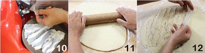 depois corte 30 fatias de um pedaço inteiro de bacon, utilizando um fatiador (se não tiver, recomendamos comprar o bacon já fatiado) 10. Polvilhe novamente a superfície de trabalho com um pouco de farinha e, com a ajuda de um rolo, abra a massa de pão em forma oval com espessura de cerca de 1-2 cm 11. Coloque as fatias de bacon sobre a massa, cobrindo completamente a superfície 12,