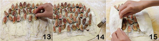 depois disponha os figos 13. Pincele as bordas da massa com água 14 e comece a fechar a massa: dobre a borda direita para dentro, depois a esquerda 15