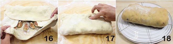 e continue dobrando também a borda superior e a inferior 16. Pressione com os dedos na junção para selar tudo 17, depois coloque o pão obtido em uma assadeira forrada com papel manteiga e leve ao forno a 200°C por 35-40 minutos. O pão recheado com bacon e figos está pronto 18, sirva à temperatura ambiente fatiado.
