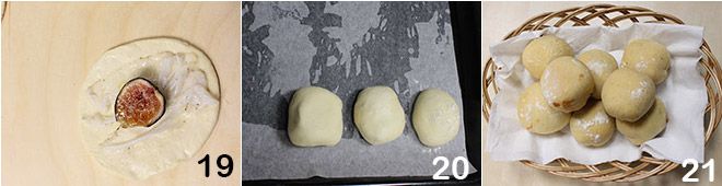 Uma alternativa saborosa pode ser preparar pãezinhos individuais. Forme com a massa de pão discos com diâmetro de cerca de 9 cm, depois coloque em cada um algumas fatias de bacon e meio figo 19. Pincele as bordas de cada disco com água e proceda a fechá-los seguindo as indicações da receita. Coloque os pãezinhos em uma assadeira coberta com papel manteiga 20 e leve ao forno a 200°C por 35-40 minutos 21.