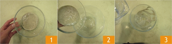 Para preparar o pão de campanha, primeiro refresque seu fermento natural em creme. Espere 4 horas 1 e transfira para uma tigela grande 2. Despeje 325 g de água na tigela que continha o fermento 3.