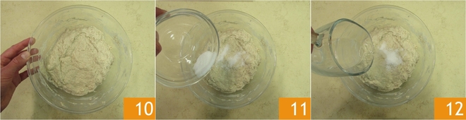 Agora deixe descansar por uma hora. Esta etapa é chamada de autólise. Após uma hora, recupere a massa 10, você notará imediatamente que ao puxá-la começará a ser mais extensível. Adicione o sal na massa 11 e despeje aos poucos mais 50 g de água 12.