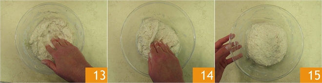 Pressione com as pontas dos dedos para dissolver o sal 13. Agora levante delicadamente uma das bordas externas da massa e leve-a ao centro 14. Gire a tigela e continue fazendo esta operação. Desta forma, a água será absorvida e a massa não gruda nas mãos. A mão, na verdade, não deve ser afundada, mas apenas colocada. Continue despejando a água e repetindo a operação, primeiro pressionando a massa e depois levando-a ao centro. Como você vê, agora a massa começa a tomar forma, dê algumas dobras na massa, dentro da tigela, depois reserve e deixe descansar por 10 minutos 15.