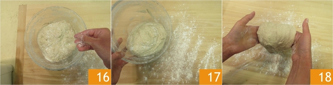 Polvilhe uma superfície com uma camada de farinha, adicione um pouco na massa 16 e transfira-a para a superfície 17. Dê algumas dobras slap and fold, levante a massa e bata-a levemente na superfície, trazendo uma parte para frente e dobrando-a sobre si mesma 18.