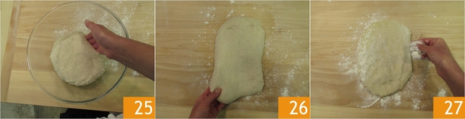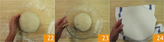 Quando a massa estiver bem lisa 22 transfira para uma tigela 23, cubra com um pano de cozinha e deixe fermentar por 3 horas a uma temperatura de 26-28°. Durante essas 3 horas, você deve dar à massa 4 voltas de dobras de reforço para torná-la ainda mais forte e extensível.