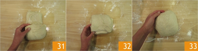 Faça o mesmo do outro lado também. Leve a parte inferior da massa para o centro 31, depois pegue a parte superior e dobre-a por cima 33. Vire-a e modele rapidamente tentando formar uma esfera 33.