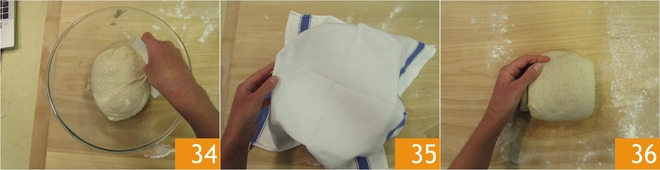 Transfira novamente para a tigela 34 e cubra com o pano 35. Estas dobras servem para dar força à massa, que de outra forma estaria muito relaxada, portanto achatada. Deixe descansar por 30 minutos, depois transfira a massa para a superfície e dê novamente uma volta de dobras como acabou de fazer 36.