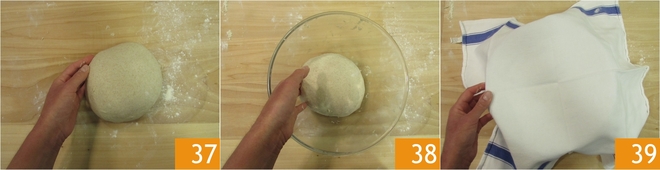 Forme novamente uma esfera 37, transfira para a tigela 38, cubra com um pano 39 e deixe descansar por 30 minutos. Repita essa operação mais 2 vezes, respeitando sempre os 30 minutos de descanso entre uma dobra e outra, totalizando 4 dobras.