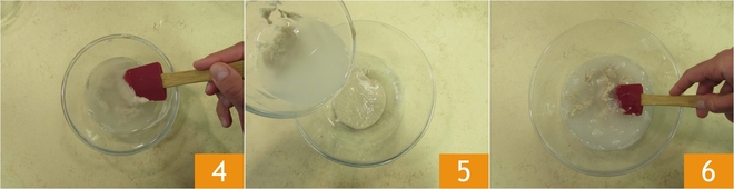 Misture para dissolver quaisquer resíduos 4 e despeje tudo na tigela grande, com o fermento 5. Misture com uma espátula para dissolver a mistura 6.