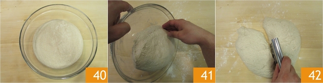 Após 3 horas, a massa terá dobrado de volume 40. Polvilhe novamente a superfície, vire a tigela e com as mãos, guie a descida da massa 41. Divida a massa em duas porções de cerca de 500 g cada uma 42.