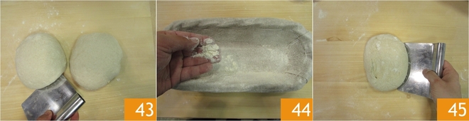 Sem trabalhar muito a massa, com a espátula, forme duas esferas 43 e deixe descansar por 15 minutos. Agora pegue dois cestos de fermentação, grandes cerca de 27x10 cm ou para 500 g de massa. Se não tiver, coloque dentro um pano de algodão. Polvilhe bem com farinha o interior dos cestos 44, já que a massa é muito hidratada. Agora forme seu pão: polvilhe a superfície com farinha e transfira uma das duas porções para cima 45.