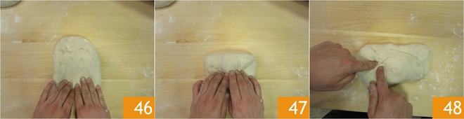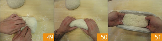Por último, levante a borda direita e leve-a para o centro 49. Vire e gire na superfície para obter um filão 50. Repita a mesma operação para a segunda massa, depois, ajudando-se com a espátula, levante uma delas e transfira para o cesto de fermentação, virando-a de cabeça para baixo, de modo que a parte lisa fique embaixo 51.