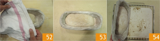 Faça o mesmo com o segundo filão, depois cubra com um pano 52. Deixe a massa maturar por 30 minutos a duas horas, dependendo da temperatura. No inverno, certamente será necessário um tempo maior, recomendamos sempre confiar em seus sentidos. Para saber se a massa está pronta, faça uma leve pressão com o dedo na massa. Se a marca desaparecer rapidamente, significa que está pronta, se permanecer impressa, você terá que esperar mais um pouco. Cubra novamente e coloque na geladeira por 15 horas. Agora dedique-se à cocção. Ligue o forno cerca de meia hora antes, aquecendo-o a uma temperatura de 230° e posicione no centro uma pedra refratária e no fundo uma tigela com água, que permitirá obter a umidade certa. Após 30 minutos, a pedra estará bem quente, retire do forno, ajudando-se com a grelha, sem se queimar, e posicione-a na superfície. Retire o pão da geladeira 53 e vire-o sobre a pedra 54. Faça o mesmo com o outro.