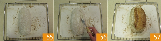 Acaricie para remover o excesso de farinha 55 e com uma lâmina faça um corte longitudinal sob a pele, inclinando a lâmina a 45° 56. Após fazer uma incisão profunda em ambos os pães, transfira rapidamente para o forno quente. Asse por 30 minutos, depois retire a tigela com água para formar a crosta e continue assando por mais 15-20 minutos. Se a cor estiver muito escura, abaixe a temperatura nos últimos minutos. Retire do forno e deixe esfriar o pão de campanha 57 antes de cortá-lo e saboreá-lo!