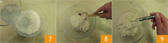 Adicione a farinha tipo 2 e a de centeio 7. Misture sempre com a espátula, limpando bem as bordas da tigela da farinha, até obter uma mistura razoavelmente homogênea, mas ainda não lisa 8. É normal que nesta fase a massa tenda a rasgar, pois a rede de glúten ainda não está bem formada. Verifique sempre a temperatura da massa, pois o fermento é muito sensível às temperaturas. A massa deve ter sempre uma temperatura em torno de 27-28° 9.