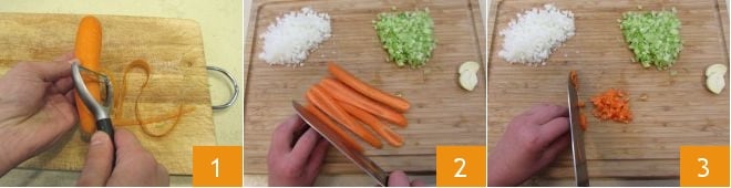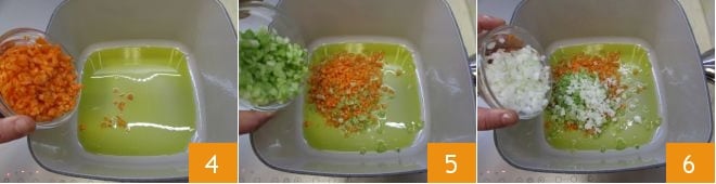 Despeje o óleo em uma panela de fundo grosso e adicione as cenouras 4, o aipo 5 e a cebola picada 6.