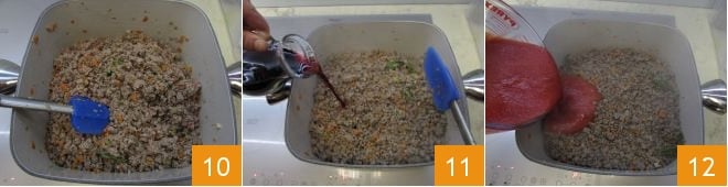 Aumente ligeiramente o fogo e deixe dourar por mais 10 minutos, mexendo com uma espátula 10, para cozinhar a carne de maneira uniforme. Neste ponto, despeje o vinho tinto 11 e, apenas quando a parte alcoólica tiver evaporado completamente, adicione o purê de tomate 12.