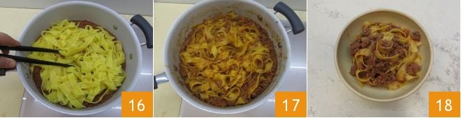 Enquanto isso, transfira o ragú para uma panela grande, escorra a massa e coloque-a na panela com o molho 16, mexa até misturar tudo 17 e sirva suas pappardelle ao ragú de javali ainda quentes 18.
