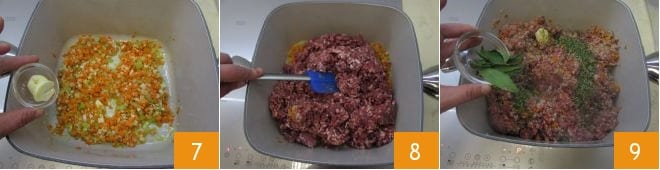 Adicione também o alho em pedaços grandes (assim você poderá removê-lo mais facilmente no final do cozimento) e deixe refogar tudo por cerca de dez minutos em fogo baixo 7. Adicione também a carne de javali picada 8, o alecrim picado e as folhas de louro 9.