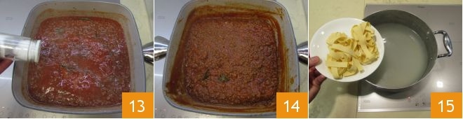 Sal a gosto 13, adicione pimenta e deixe cozinhar coberto por cerca de 3 horas e meia em fogo baixo; depois, retire a tampa e deixe o ragú secar por mais 30 minutos 14. Cozinhe suas pappardelle em água fervente abundante, salgada a gosto 15.