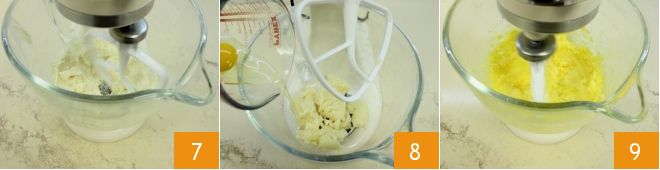 e transferir a massa para a tigela de uma batedeira planetária 7 (ou em uma tigela para trabalhar com uma colher de pau ou batedeira elétrica). Adicione um ovo de cada vez 8, esperando que o anterior seja absorvido antes de adicionar o próximo; enquanto adiciona os ovos, continue usando as pás 9.